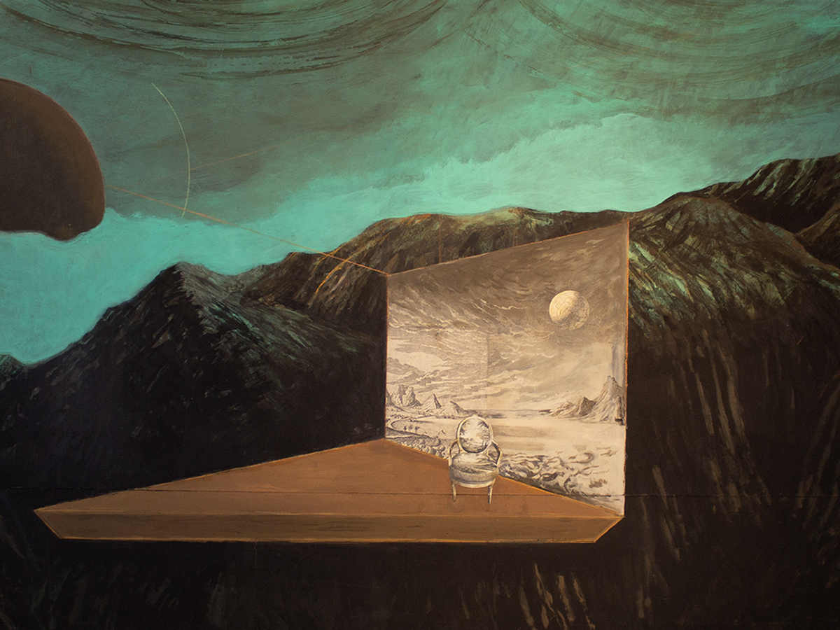 Motiven är sällan bestämda på förhand utan får växa fram och ändras under arbetets gång. Ödsliga landskap och arkitektoniska element bildar fond för scenerna som utspelar sig i gränslandet mellan dröm och verklighet. Mitt mål är att motiven ska gå att tolka på olika sätt – både av olika betraktare, men också att tolkningen kan skifta över tid för samma betraktare.